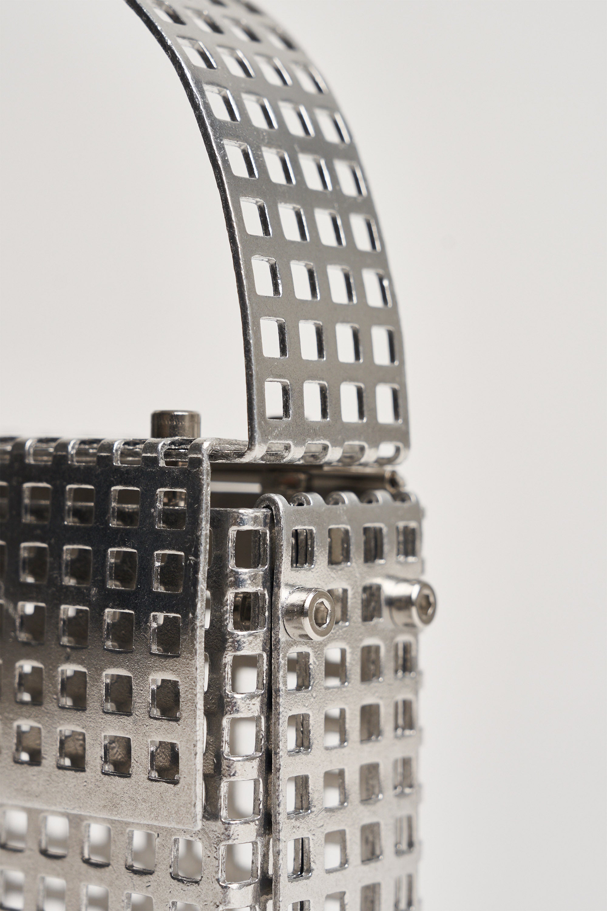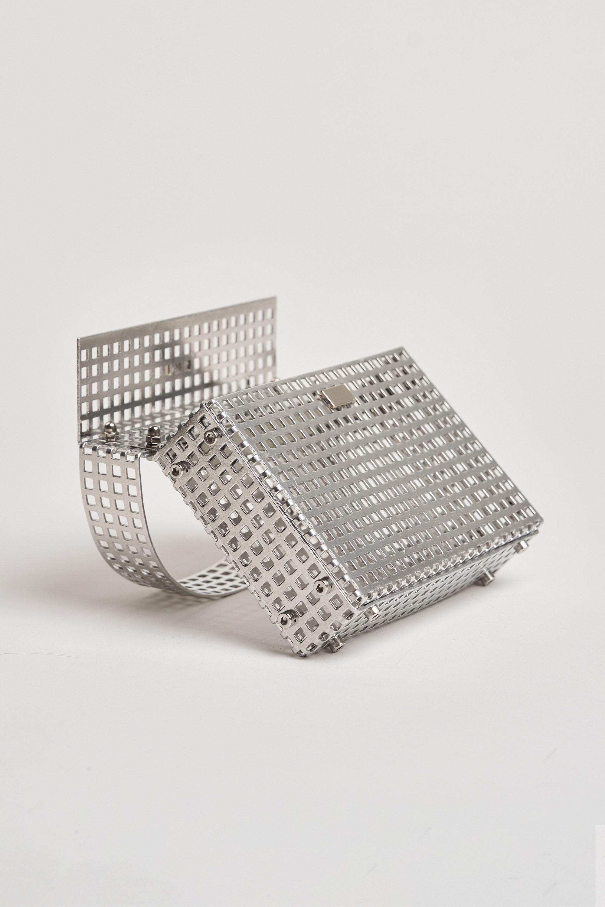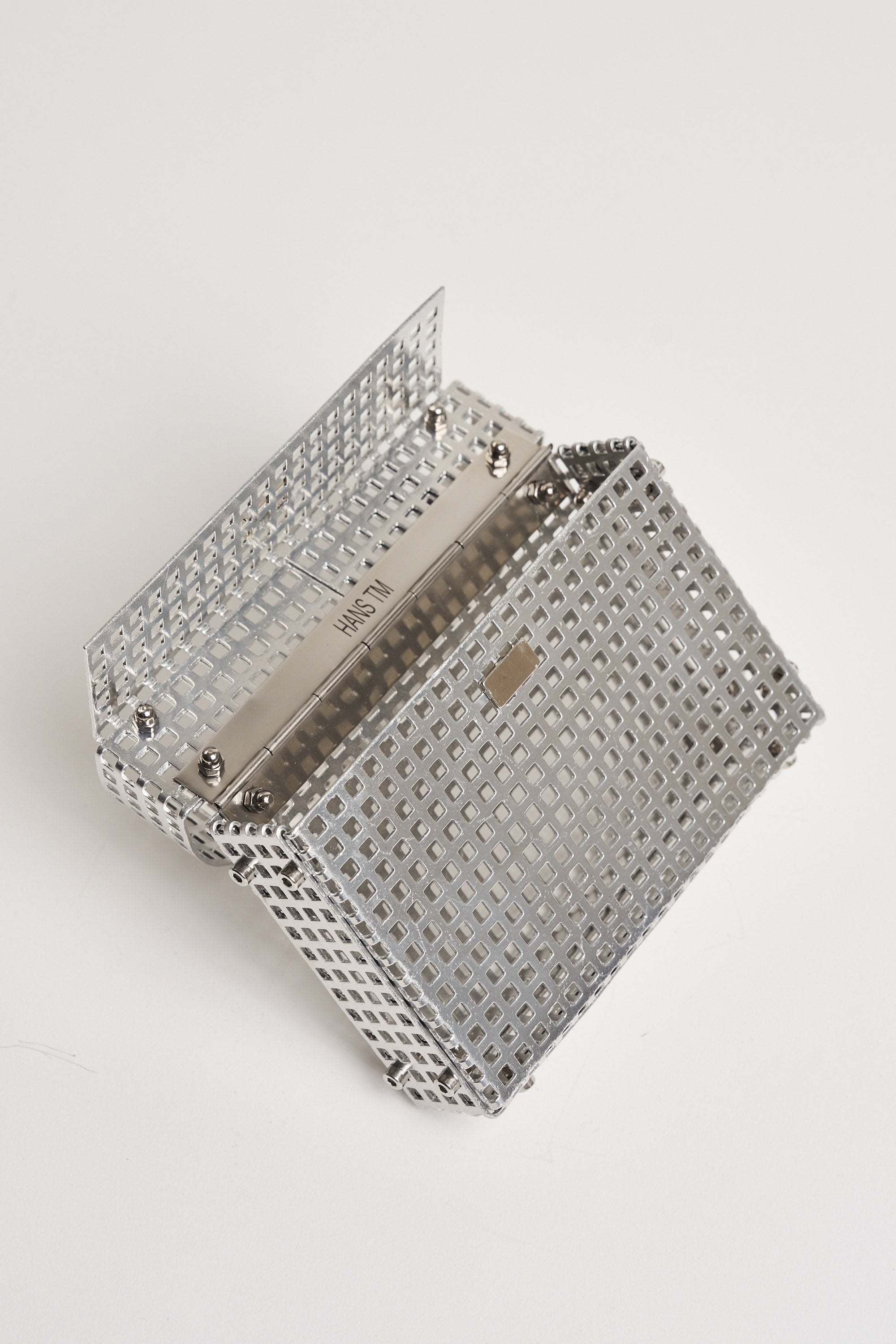 The Metal Bag is a bold, industrial-inspired design by the label HANS TM. Handcrafted in Germany fromn aluminum and stainless steel, it features square-perforated metal accented with bolts